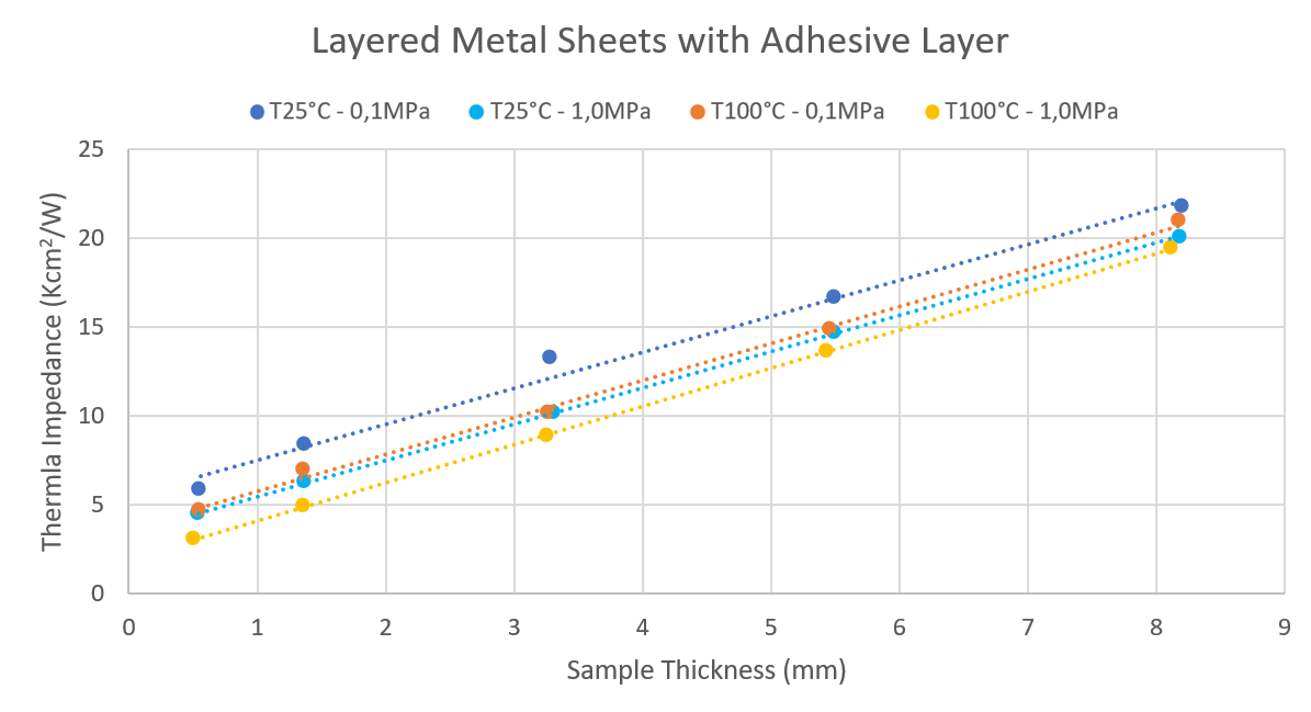 Das bedeutet, dass je nach angewandtem Anpressdruck und damit je nach Anwendung die Wärmeleitfähigkeit der Probe variieren kann. Diese Variation kann mit der verformbaren Klebeschicht zwischen den Blechen zusammenhängen.