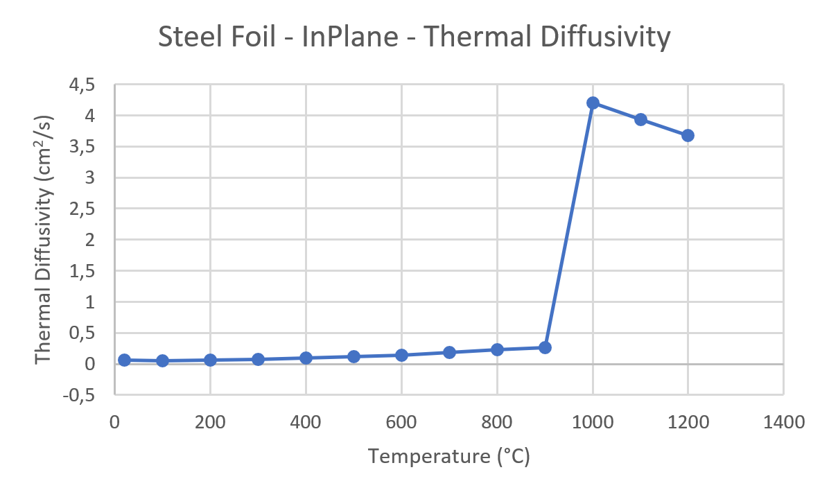Die Messung der dünnen Stahlfolie wurde von Raumtemperatur bis 1.200 °C durchgeführt. Von Raumtemperatur bis 900 °C nimmt die Temperaturleitfähigkeit mit der Temperatur zu. Ein schneller Anstieg der Temperaturleitfähigkeit ist zwischen 900 °C und 1.000 °C zu beobachten. In diesem Temperaturbereich beginnt die Probe zu schmelzen, was zu einer drastischen Änderung der Temperaturleitfähigkeit führt. Eine weitere Erhöhung der Temperatur führt zu einer Abnahme der Temperaturleitfähigkeit.