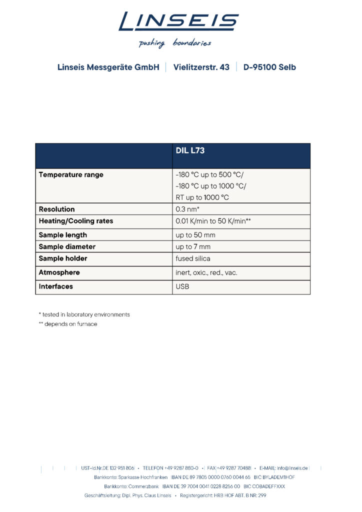The LINSEIS Laser Dilatometer DIL L75 Laser (DIL L73 Laser) enables expansion measurements with unprecedented accuracy and resolution in the picometer range is available here (0.3 nanometers = 300 picometers). In best case, resolutions that are 33 times better than those of a conventional push rod dilatometer can be achieved.