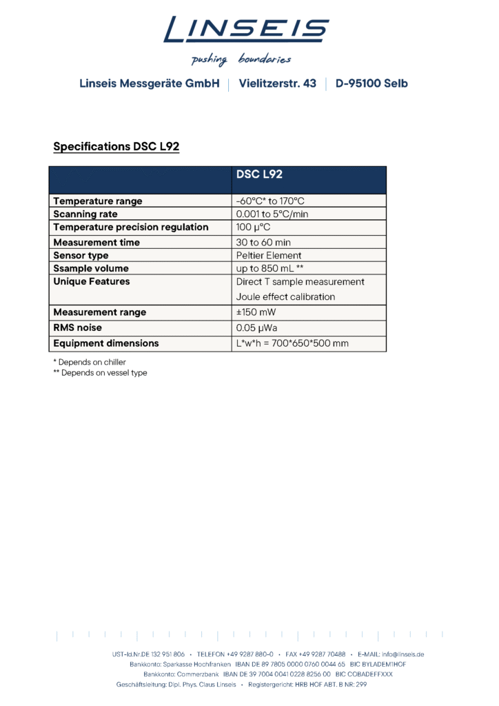 Équipé de cellules de mesure interchangeables, le système couvre un large éventail d’applications. Les cellules Cp par lots et à haute pression permettent des déterminations très précises de la capacité thermique, tandis que les cellules à deux compartiments et à flux continu permettent des études avancées des réactions chimiques, des enthalpies de mélange et des processus de dissolution des gaz sous des pressions allant jusqu’à 100 bars. Cette flexibilité fait du DSC L92 un outil puissant pour les mesures de routine et les travaux de recherche spécialisés.