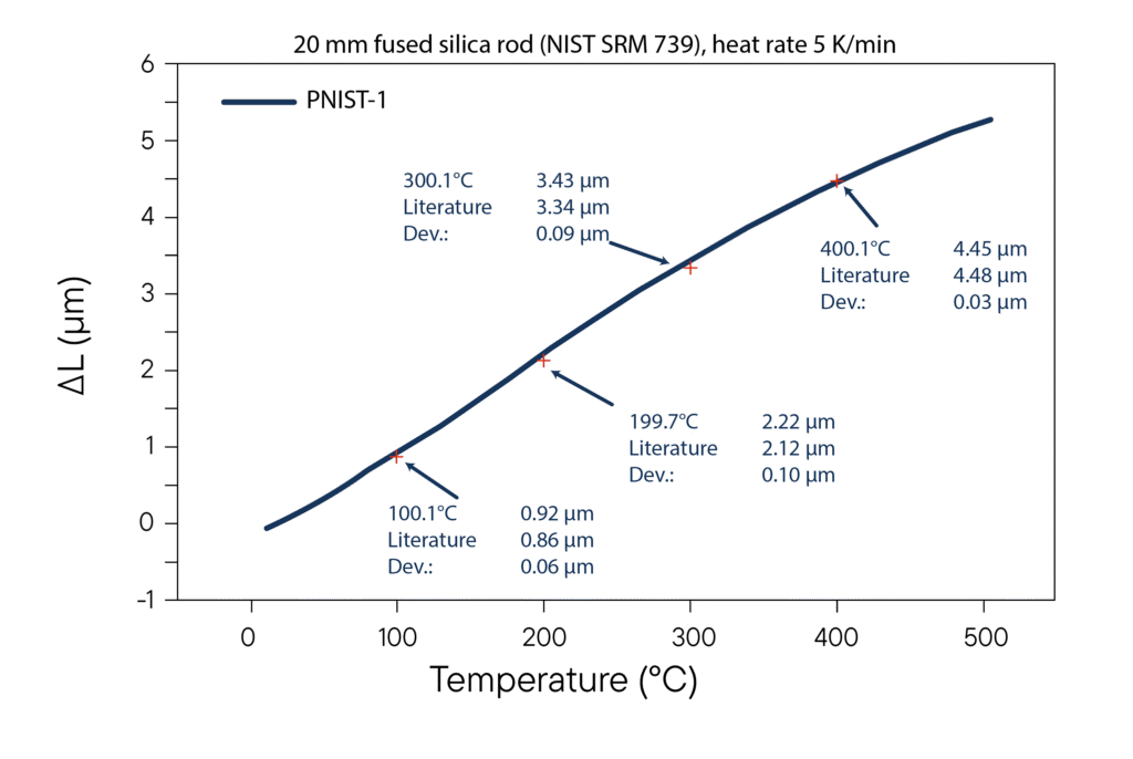 달성 가능한 측정 정확도의 실제 예는 20mm 길이의 용융 실리카 기준봉(NIST SRM 739)의 팽창 측정 조사에 나와 있습니다. 5K/min의 가열 속도에서 최대 500°C의 온도 범위에 걸쳐 열 길이 변화를 측정했습니다. 측정값은 문헌 데이터와 매우 잘 일치하며 편차는 여러 온도 지점에서 0.03 µm에서 0.26 µm에 불과합니다. 이 결과는 유리성 물질의 특성 분석을 위한 간섭계 또는 레이저 기반 팽창도 측정의 높은 정밀도를 확인시켜 줍니다.