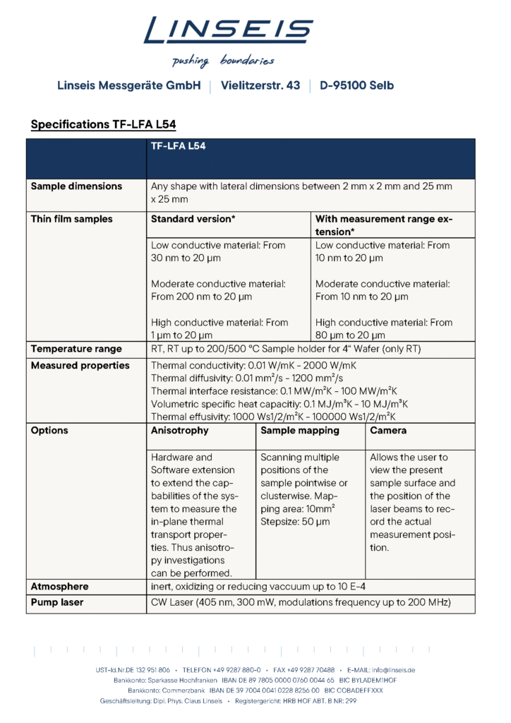 Das TF-LFA L54 wurde für Forschungszwecke und hochwertige industrielle Anwendungen entwickelt und kombiniert außergewöhnliche Empfindlichkeit, einen breiten Temperaturbereich (von Raumtemperatur bis zu 500 °C) und modulare Optionen für Anisotropie, Probenkartierung und optische Visualisierung.